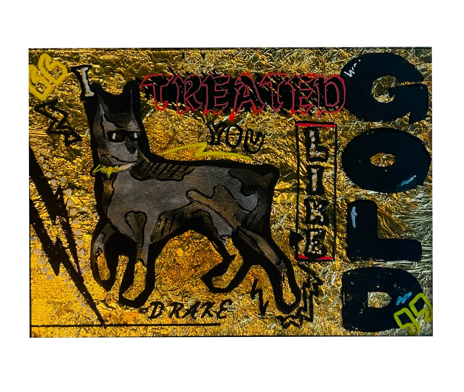 Mixed media piece. I drew the dog and layered drawn elements onto hand placed gold leaf. Much of the wording I drew directly onto the glass with marker.