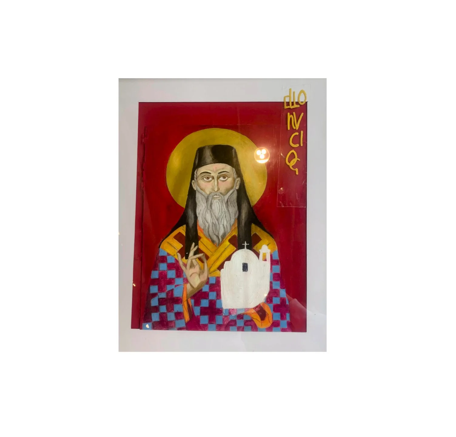 Depicted is Saint Dionysios. While in Greece I had the opportunity to venerate the Saint, an experience which many desire. He is considered a walking Saint His velvet slippers even while remaining in a cascate need to change every few months cause they get dingy and dirty. He goes around the Ionian Islands performing miracles. While in Greece I got to observe a miracle he had performed at the camp I attended.